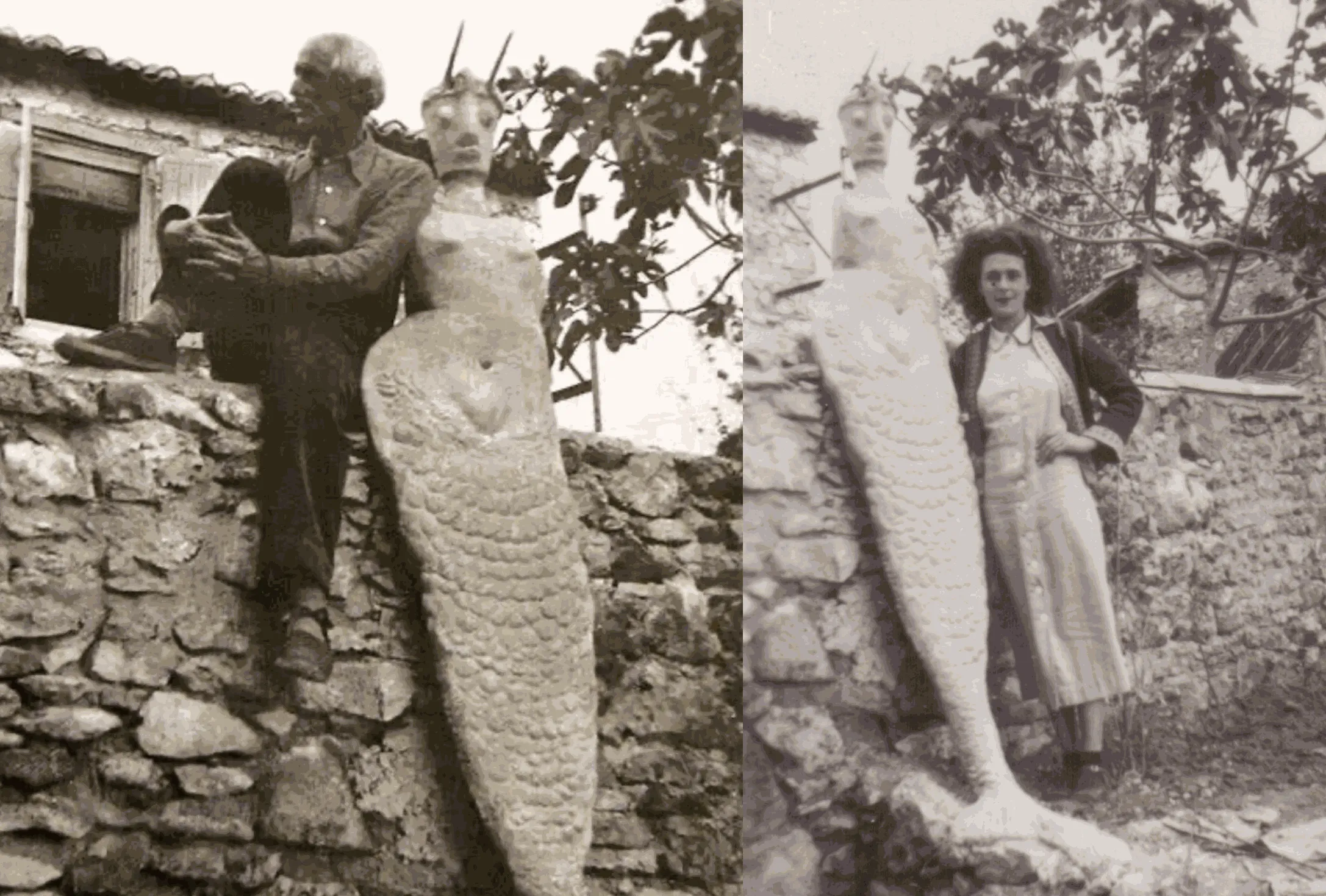 Along with those by Miller and Penrose, other photographs show the coexistence between the artists who lived in the house and these sculptures. Two images provide very relevant information: in one, Carrington poses next to a standing mermaid statue; in the other, Ernst is seated on the wall that supports the mermaid while leaning on her shoulder, occupying the place that will soon be that of a powerful sphinx. These images are the best examples of the self-referential character of the picto-sculptural ensemble devised by Ernst.