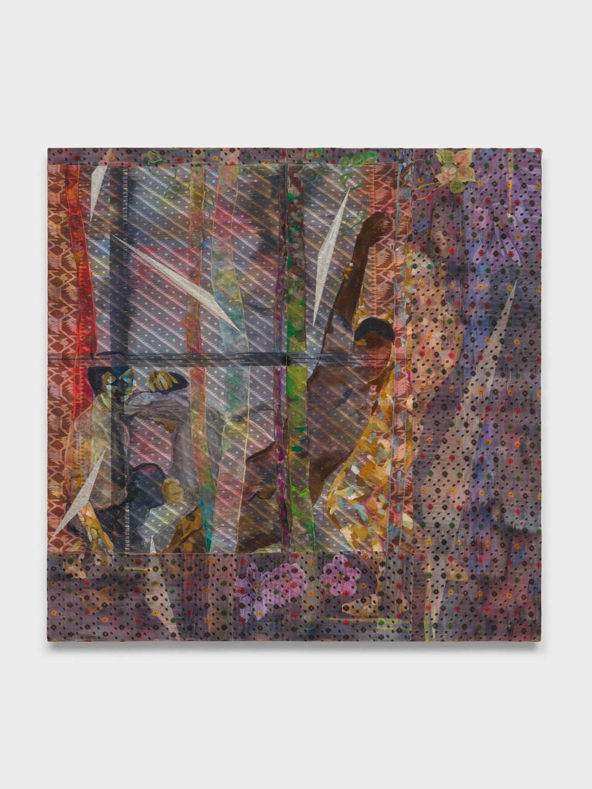 In Mukherjee’s paintings, the transitional conditions of The Long Middle arise through layered textile surfaces, geometric shards, and an interest in the tension between the static image, choreographed performance, and lived experience. She builds her paintings from pigment, crystalina, and ink printed on cotton jamdani and silk sari on linen, which acts as an architectural screen that simultaneously reveals and conceals what lies beneath it. She also deploys shards of geometric forms that cut through organic painted imagery—a technique she used to striking effect in her 2025 commission for the San Francisco Ballet curtain drop—which, like her cloth overlays, introduce a layer of visual dissonance that disrupts the expected syntax of each scene.