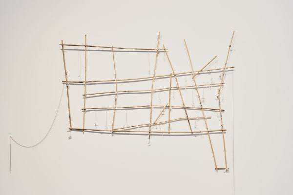 Expanding on maps as tools of wayfinding, Michael Arcega's Prih-Sohn Stick Chart (Map of isolation chambers), 2015, uses bamboo, crystal, and natural fiber to create a map of the locations of the United States prison system's solitary confinement units. The work directly references the Polynesian use of stick charts to map oceanic navigation, while presenting the moral and ethical issues surrounding the criminal justice system. In juxtaposition, is Val Britton's never-before-exhibited 17-foot long Study for Voyage. Originally created as a study for her permanent public commissioned work, Voyage, at the San Francisco International Airport, this work compares and contrasts elements of the airport and its environs that have remained fixed and those elements that are in a constant state of geological or environmental flux.